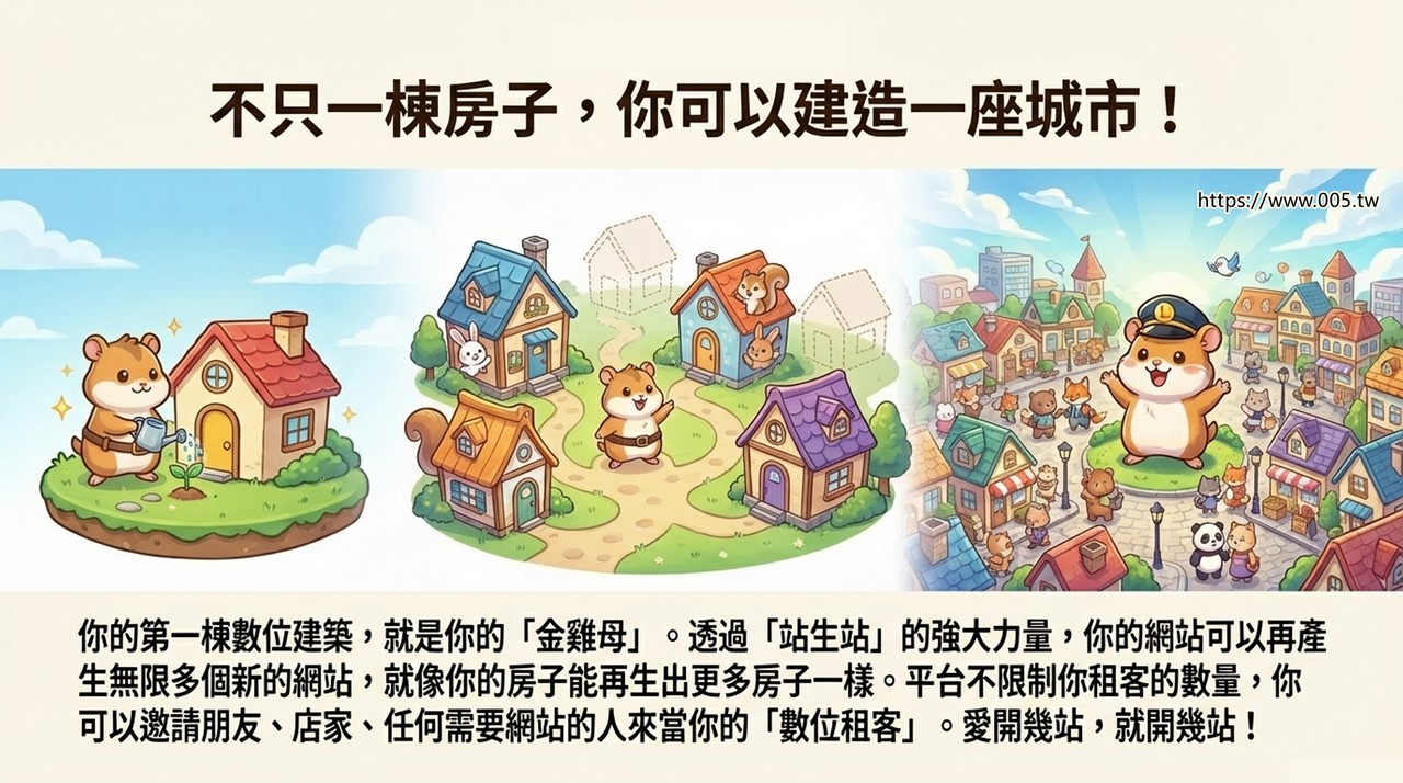 透過「站生站」的強大力量,你的網站可以再產生無限多個新的網站,就像你的房子能再生出更多房子一樣。平台不限制你租客的數量,你可以邀請朋友、店家、任何需要網站的人來當你的「數位租客」。愛開幾站,就開幾站!